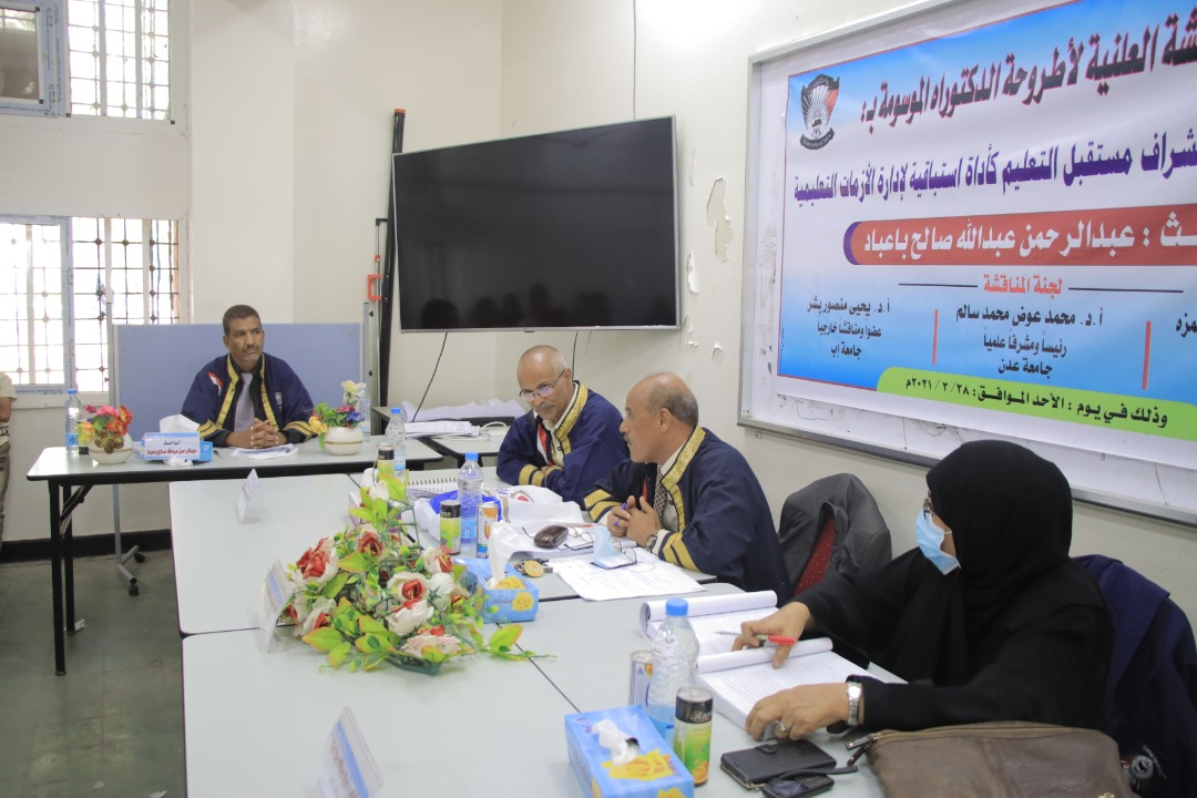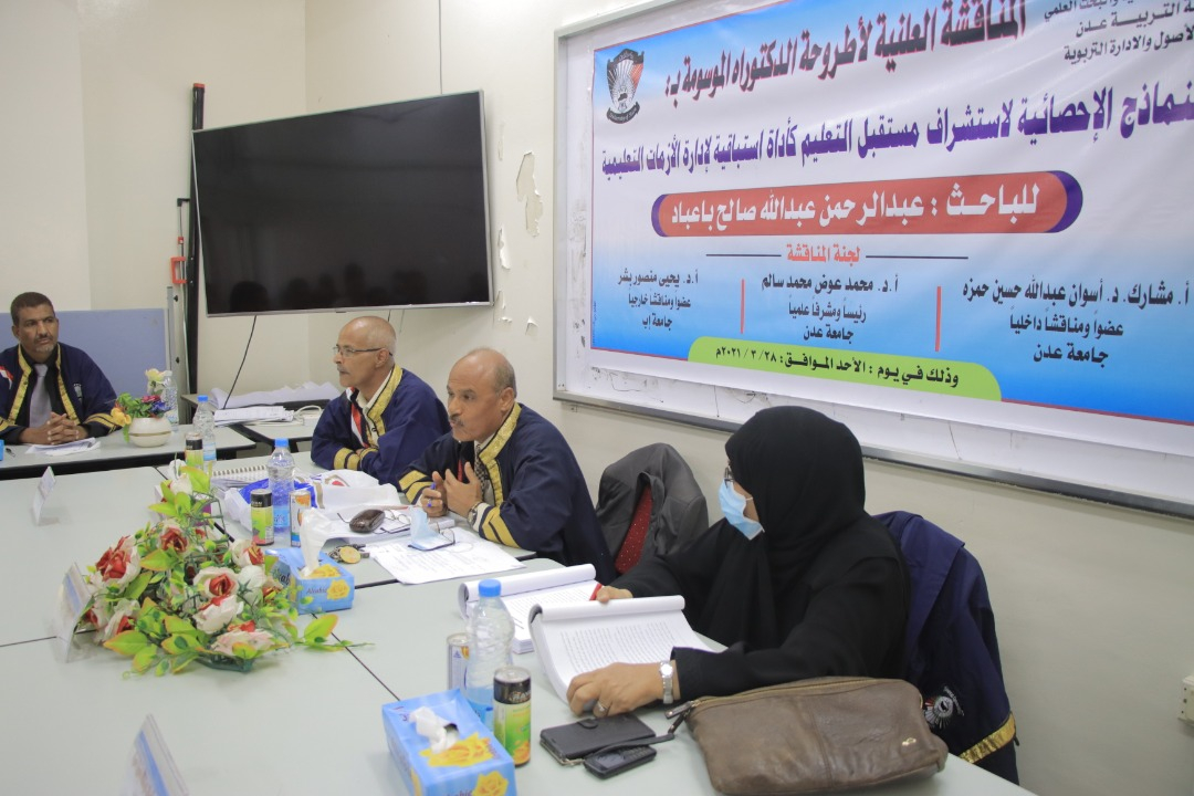 واستمع الجعدي بمعية الحاضرين إلى الرسالة العلنية للأطروحة التي قدمها الباحث عبدالرحمن باعباد والموسومة بـ" النماذج الإحصائية لاستشراف مستقبل التعليم كأداة استباقية لإدارية الأزمات التعليمية"، أمام لجنة مناقشة تكونت من أ.د. محمد عوض محمد سالم رئيساً، وعضوية وأ. مشارك د. أسوان عبدالله حسن حمزة ، وأ. د. يحيى منصور بشر عضوا.