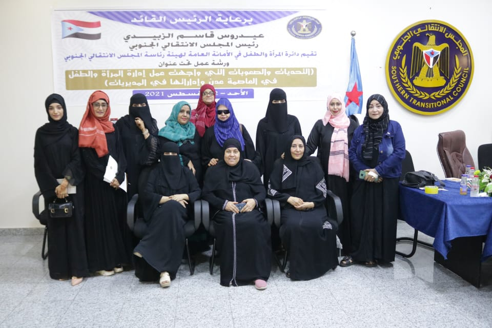 نظمت دائرة المرأة والطفل في الأمانة العامة لهيئة رئاسة المجلس الانتقالي، اليوم الأحد، ورشة عمل حول "التحديات والصعوبات التي تواجه عمل إدارات المرأة والطفل في العاصمة عدن و مديرياتها " برعاية الرئيس القائد عيدروس قاسم الزُبيدي رئيس المجلس الانتقالي الجنوبي.