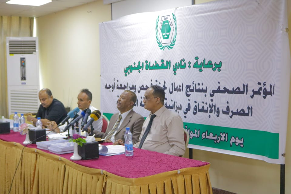 عقد نادي القضاة الجنوبي، اليوم الأربعاء في العاصمة عدن مؤتمراً صحفياً لاستعراض نتائج ما انتهت إليه اللجنة المكلفة بالفحص والمراجعة والتدقيق لأوجه الصرف والانفاق في ميزانية السلطة القضائية، بحضور الأستاذ فضل محمد الجعدي نائب الأمين العام لهيئة رئاسة المجلس الانتقالي الجنوبي، والمحامية نيران سوقي، عضو هيئة رئاسة المجلس، نائب رئيس الجمعية الوطنية.