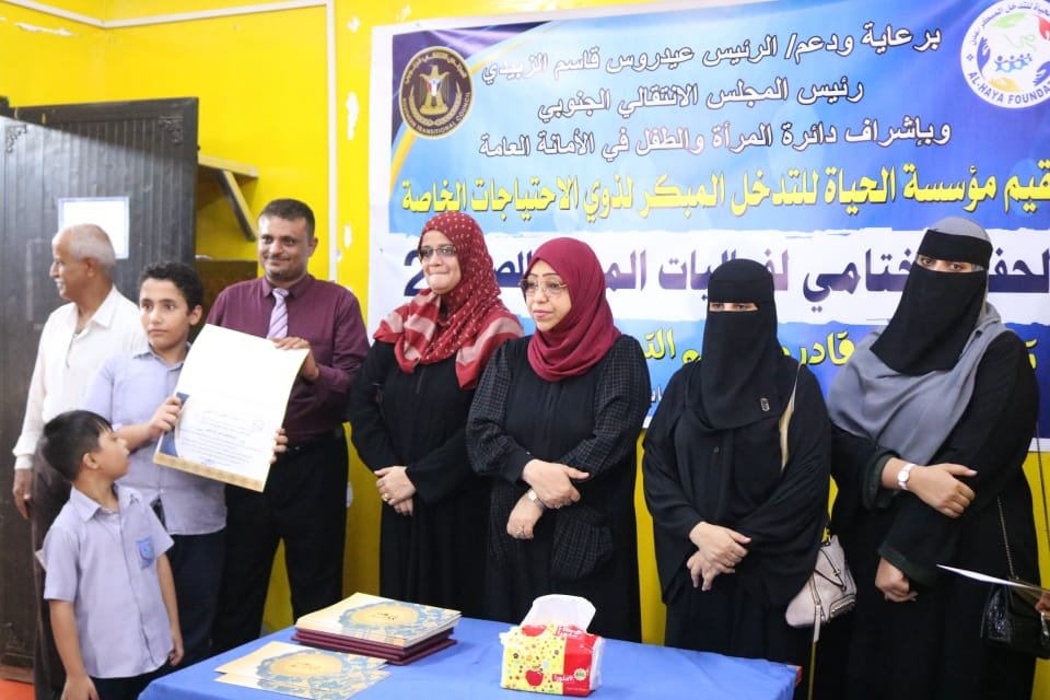 نظمت مؤسسة الحياة للتدخل المبكر لذوي الاحتياجات الخاصة، اليوم الأحد، حفلا فنيا بمناسبة ختام فعاليات المخيم الصيفي الثاني، برعاية كريمة من الرئيس القائد عيدروس الزُبيدي رئيس المجلس الانتقالي الجنوبي، وتحت إشراف دائرة المرأة والطفل في الأمانة العامة لهيئة رئاسة المجلس.