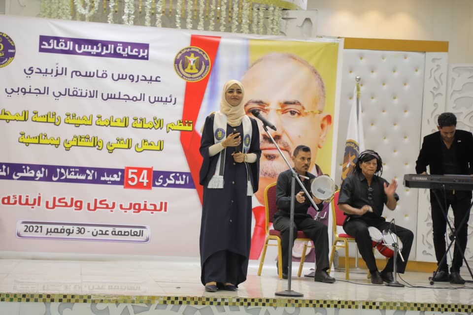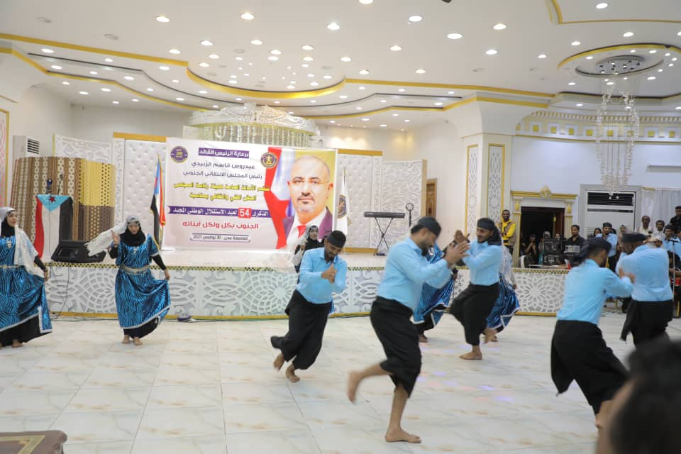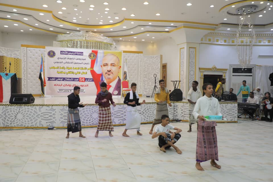 أقامت الأمانة العامة لهيئة رئاسة المجلس الانتقالي الجنوبي اليوم الثلاثاء، في العاصمة عدن، حفلا فنيا وثقافيا بمناسبة حلول الذكرى 54 لعيد الاستقلال الوطني المجيد 30 نوفمبر، برعاية كريمة من الرئيس القائد عيدروس قاسم الزُبيدي رئيس المجلس الانتقالي الجنوبي، وبحضور أعضاء هيئة رئاسة المجلس، الأستاذ فضل الجعدي نائب الأمين العام للأمانة العامة لهيئة الرئاسة، والمحامية نيران سوقي نائب رئيس الجمعية الوطنية، والدكتور عبدالناصر الوالي وزير الخدمة المدنية، والمهندس نزار هيثم رئيس تنفيذية انتقالي العاصمة عدن.