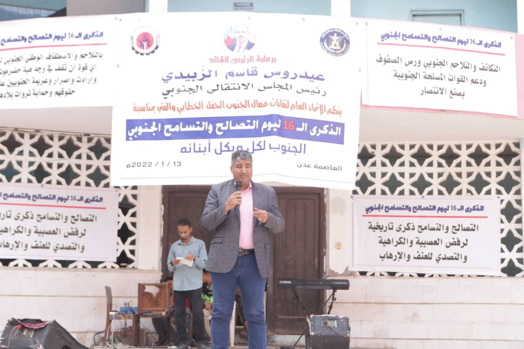 كما، ألقيت في الحفل كلمة الاتحاد العام لنقابات عمال الجنوب ألقاها الأستاذ سامي خيران رئيس الاتحاد، أشار فيها إلى أن تنظيم هذا الحفل في مبنى الاتحاد التاريخي في العاصمة عدنؤ يأتي من كون الحركة النقابية هي أحد روافد العمل الوطني والداعمه لحرية شعب الجنوب وحقه في استعادة أرضه كاملة السيادة .