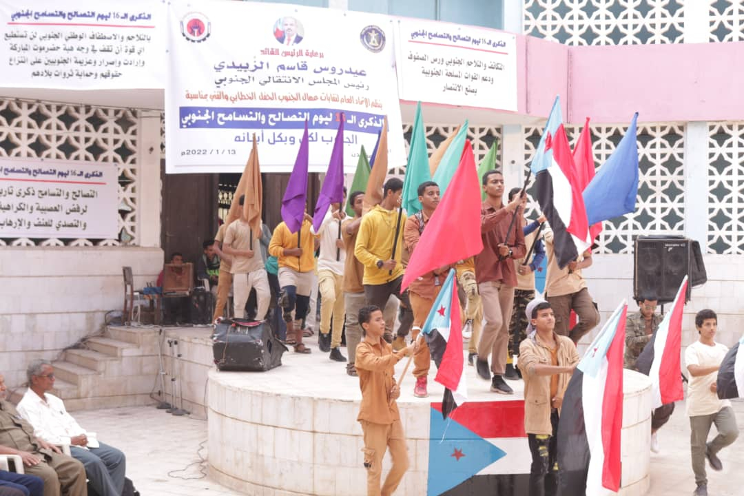 شهدت العاصمة عدن ،اليوم الخميس، الحفل الخطابي والفني بمناسبة الذكرى الـ 16 ليوم التصالح والتسامح الجنوبي الذي نظمه الاتحاد العام لنقابات عمال الجنوب برعاية الرئيس القائد عيدروس قاسم الزُبيدي رئيس المجلس الانتقالي الجنوبي.