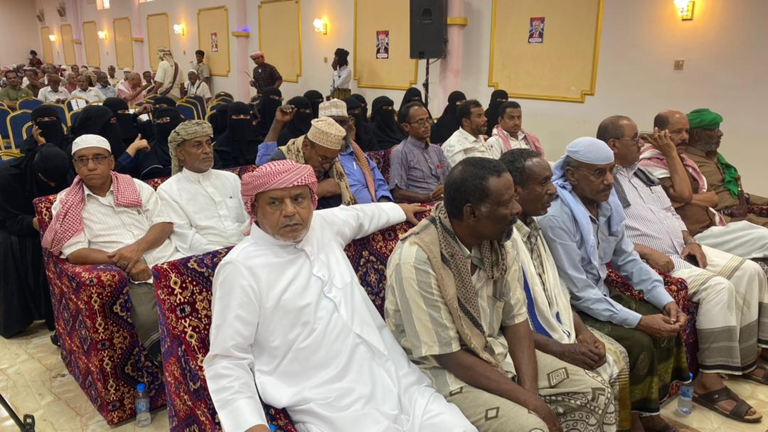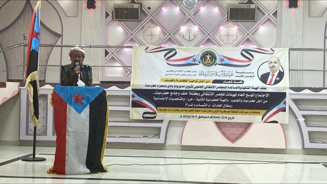 وشدد المحمدي في كلمة وقوف المجلس الانتقالي إلى جانب المطالب المشروعة لأبناء حضرموت في الوادي والصحراء لتمكينهم إدارة وحماية مناطقهم.