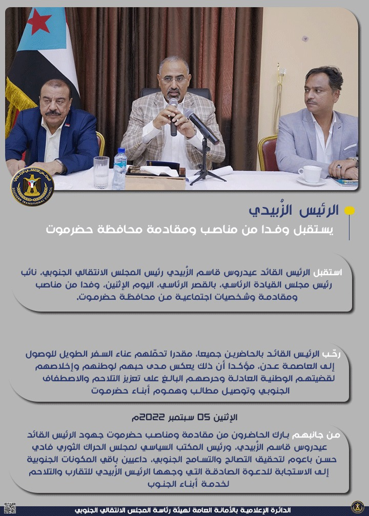 الرئيس الزُبيدي يشدد على أهمية الصيانة الدورية لشبكة الطرق التقى الرئيس القائد عيدروس قاسم الزُبيدي، رئيس المجلس الانتقالي الجنوبي، نائب رئيس مجلس القيادة الرئ...