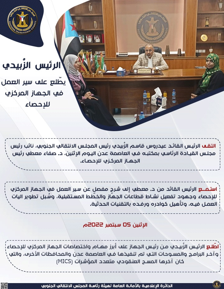 حفظ الصورة الرئيس الزُبيدي يطّلع على سير العمل في الجهاز المركزي للإحصاء الإثنين ٠٥ سبتمبر ٢٠٢٢ الساعة ٠٩:٠٦ مساءً الرئيس الزُبيدي يطّلع على سير العمل في الجهاز المركزي للإحصاء