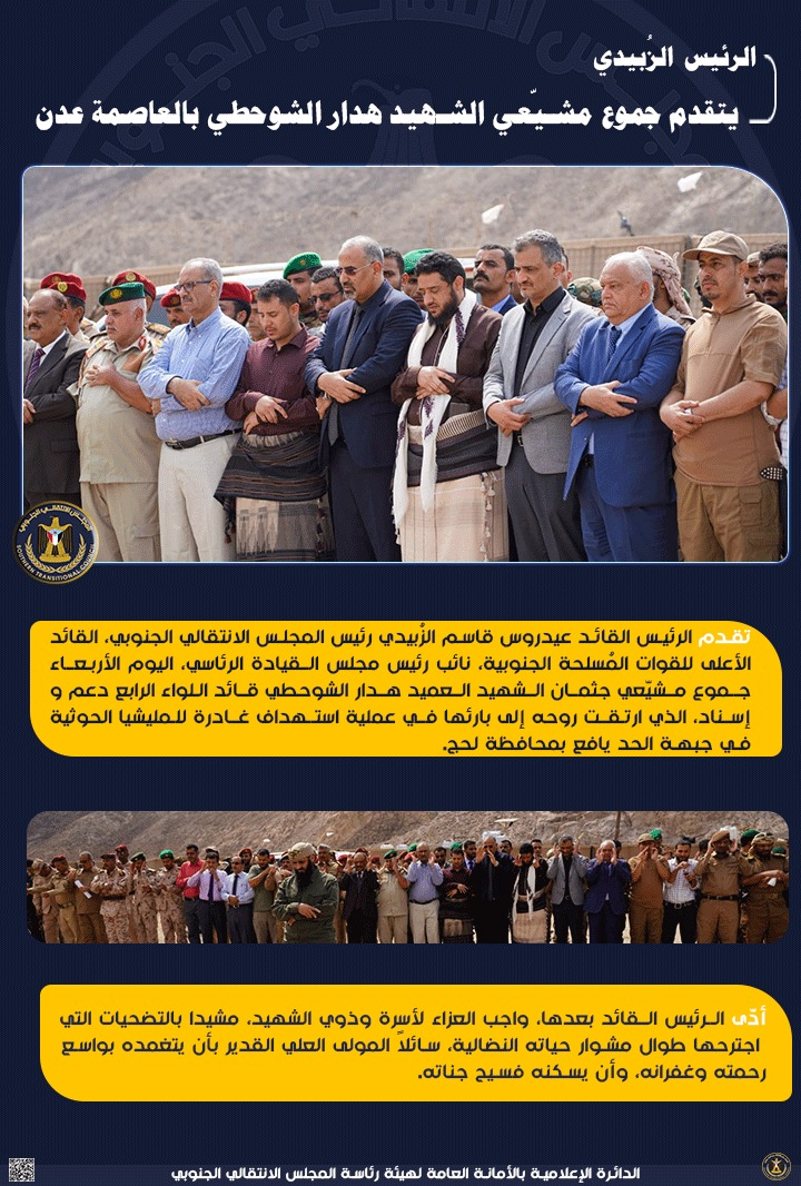 الرئيس الزُبيدي يشدد على أهمية الصيانة الدورية لشبكة الطرق التقى الرئيس القائد عيدروس قاسم الزُبيدي، رئيس المجلس الانتقالي الجنوبي، نائب رئيس مجلس القيادة الرئ...