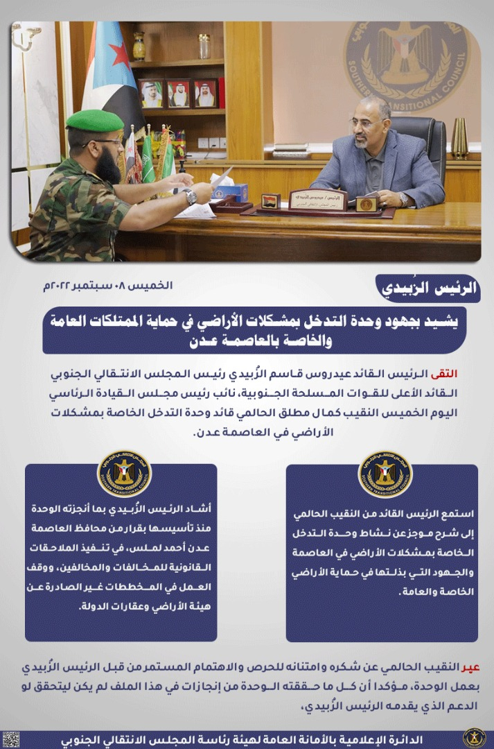 الرئيس الزُبيدي يشيد بجهود وحدة التدخل بمشكلات الأراضي في حماية الممتلكات العامة والخاصة بالعاصمة عدن
