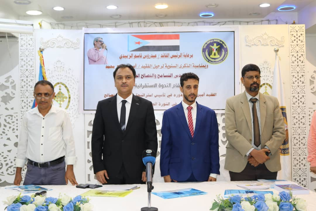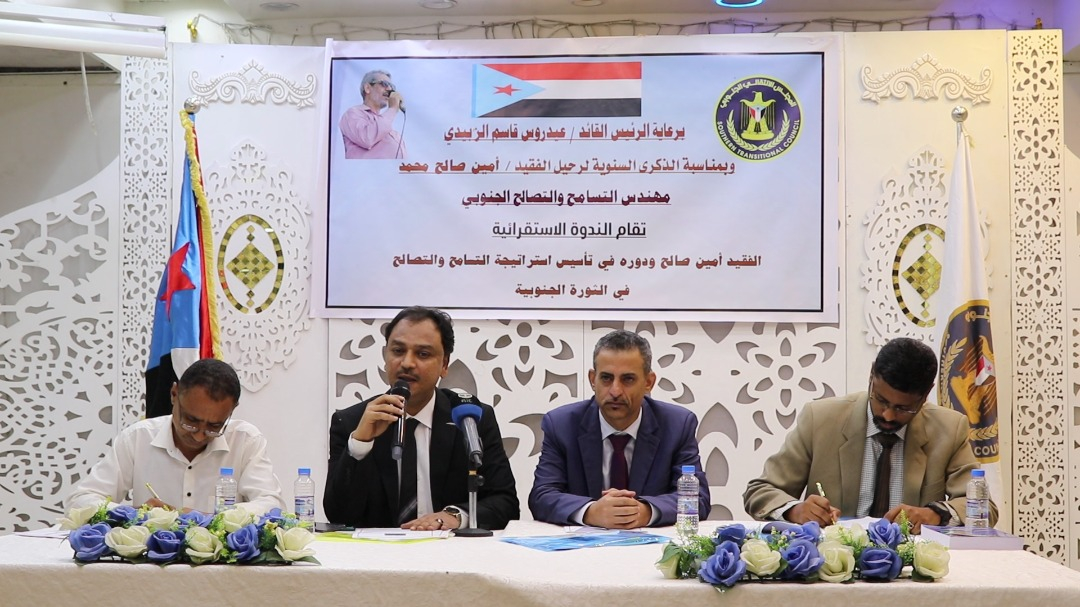 أقيمت ،اليوم السبت، في العاصمة عدن ندوة استقرائية بمناسبة الذكرى السنوية لرحيل الفقيد المناضل امين صالح عضو هيئة رئاسة المجلس الانتقالي الجنوبي، بعنوان "استراتيجية الفقيد امين صالح في التسامح والتصالح الجنوبي وتأثيره على الثورة الجنوبية"، برعاية من الرئيس القائد عيدروس قاسم الزُبيدي، رئيس المجلس الانتقالي الجنوبي، نائب رئيس مجلس القيادة الرئاسي وبمشاركة عضوي هيئة رئاسة المجلس الانتقالي الأستاذ فضل الجعدي نائب الامين العام بالأمانة العامة لهيئة رئاسة المجلس، واللواء سالم السقطري وزير الزراعة والري والثروة السمكية.