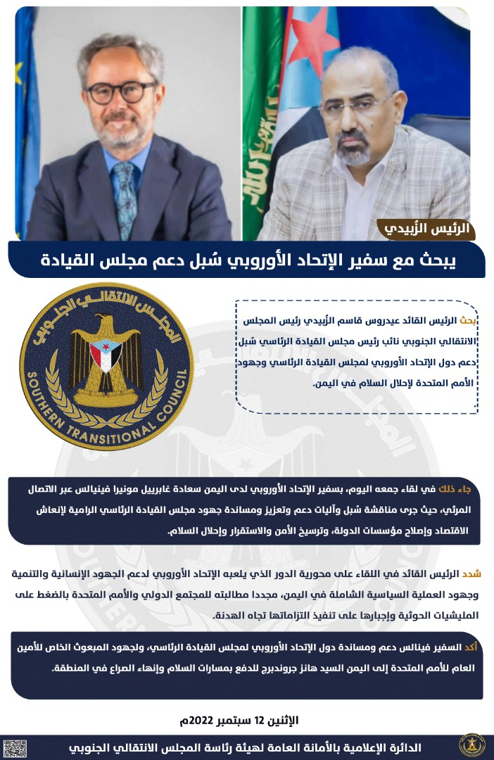 الرئيس الزُبيدي يبحث مع سفير الإتحاد الأوروبي سُبل دعم مجلس القيادة وجهود وإحلال السلام