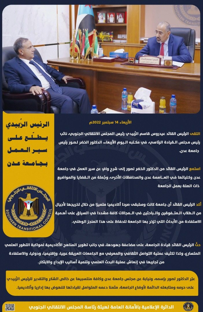 حفظ الصورة الرئيس الزُبيدي يطّلع من الدكتور لصور على سير العمل بجامعة عدن الأربعاء ١٤ سبتمبر ٢٠٢٢ الساعة ٠٨:٣٦ مساءً الرئيس الزُبيدي يطّلع من الدكتور لصور على سير العمل بجامعة عدن