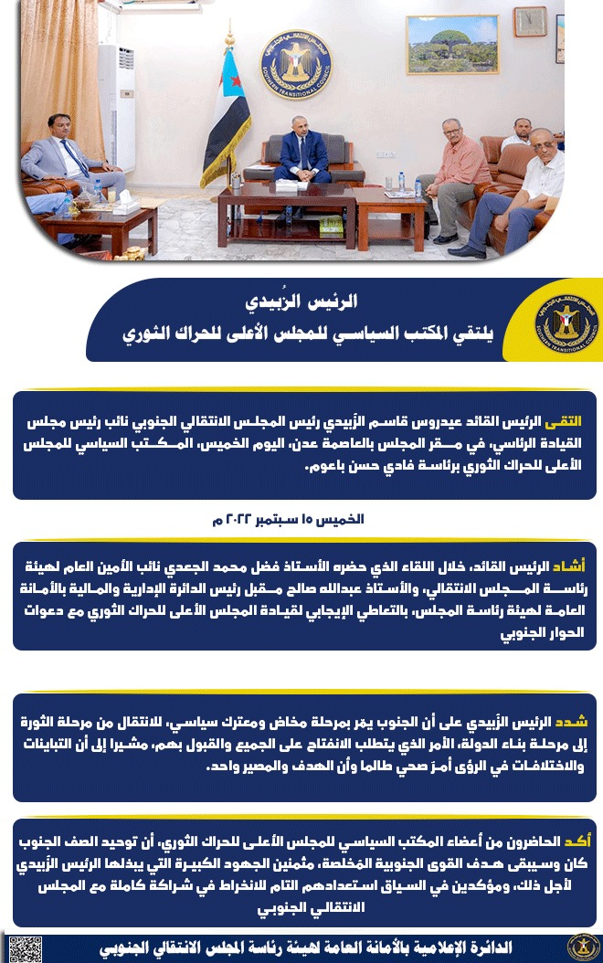 حفظ الصورة الرئيس الزُبيدي يلتقي المكتب السياسي للمجلس الأعلى للحراك الثوري الخميس ١٥ سبتمبر ٢٠٢٢ الساعة ١٠:٢٥ مساءً الرئيس الزُبيدي يلتقي المكتب السياسي للمجلس الأعلى للحراك الثوري