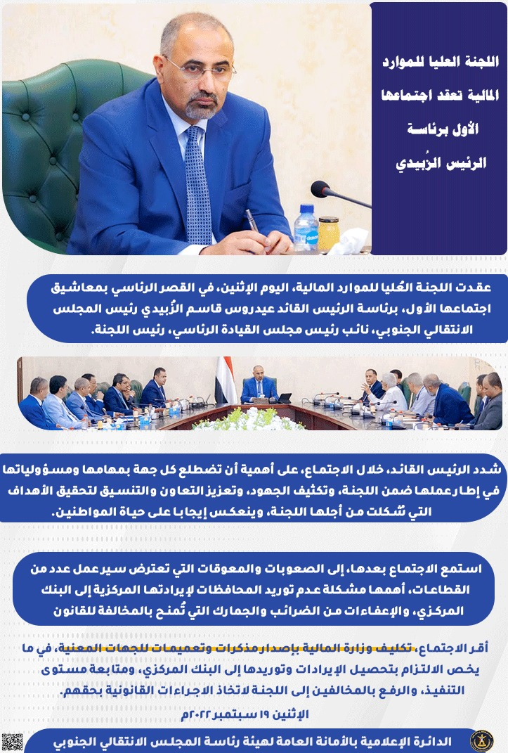 حفظ الصورة اللجنة العليا للموارد المالية تعقد اجتماعها الأول برئاسة الرئيس الزُبيدي الإثنين ١٩ سبتمبر ٢٠٢٢ الساعة ١١:٤٧ مساءً اللجنة العليا للموارد المالية تعقد اجتماعها الأول برئاسة الرئيس الزُبيدي