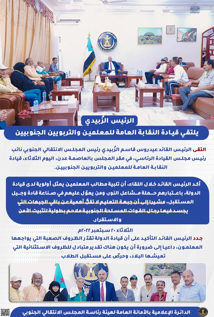 الرئيس الزُبيدي يلتقي قيادة النقابة العامة للمعلمين والتربويين الجنوبيين ويشدد على سرعة استئناف العملية التعليمية