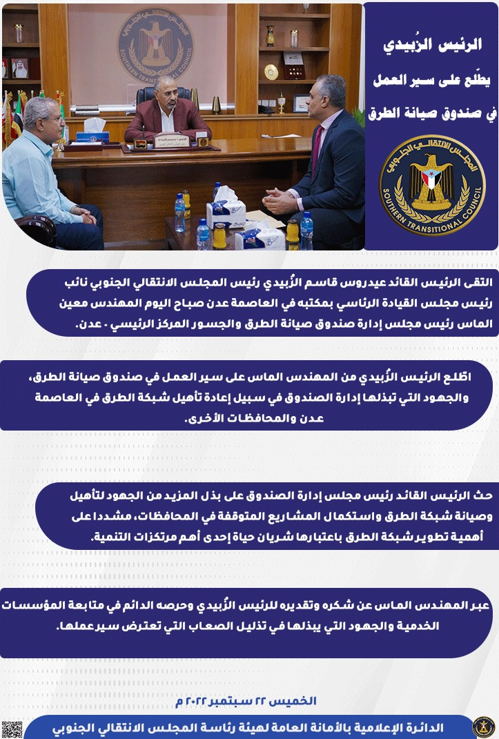 الرئيس الزُبيدي يطّلع على سير العمل في صندوق صيانة الطرق