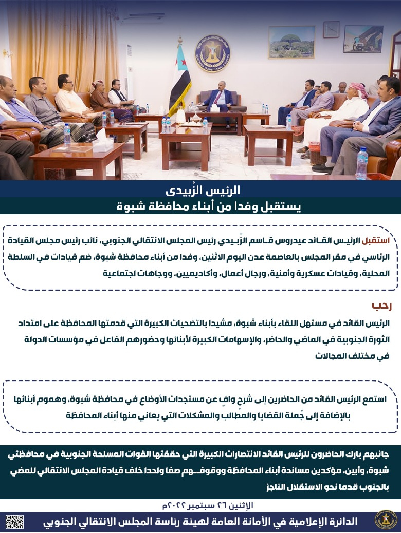 حفظ الصورة الرئيس الزُبيدي يستقبل وفدا من أبناء محافظة شبوة الإثنين ٢٦ سبتمبر ٢٠٢٢ الساعة ٠٨:٥٩ مساءً الرئيس الزُبيدي يستقبل وفدا من أبناء محافظة شبوة