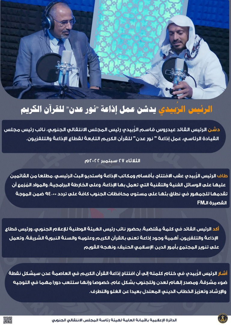حفظ الصورة الرئيس الزُبيدي يدشن عمل إذاعة "نور عدن" للقرآن الكريم الثلاثاء ٢٧ سبتمبر ٢٠٢٢ الساعة ٠٨:٥٥ مساءً الرئيس الزُبيدي يدشن عمل إذاعة "نور عدن" للقرآن الكريم