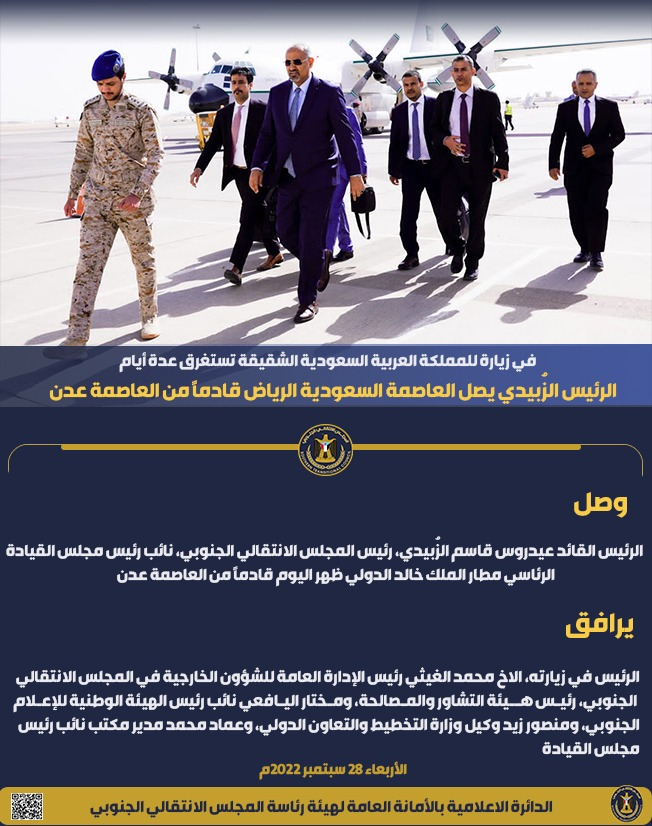 حفظ الصورة الرئيس الزُبيدي يصل العاصمة السعودية الرياض قادماً من العاصمة عدن الأربعاء ٢٨ سبتمبر ٢٠٢٢ الساعة ٠٨:٥٣ مساءً الرئيس الزُبيدي يصل العاصمة السعودية الرياض قادماً من العاصمة عدن