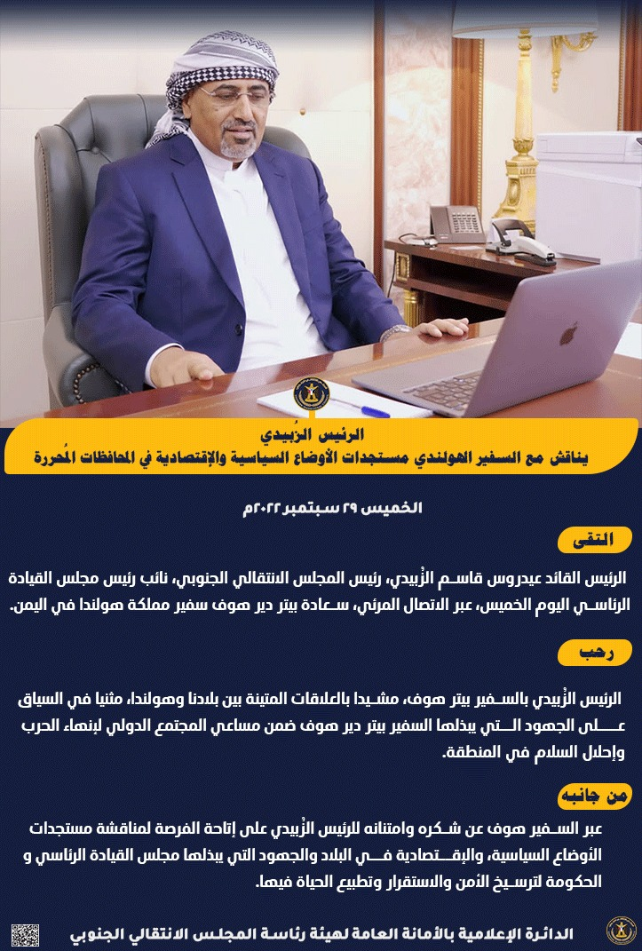 الرئيس الزُبيدي يناقش مع السفير الهولندي مستجدات الأوضاع السياسية والإقتصادية في المحافظات المُحررة