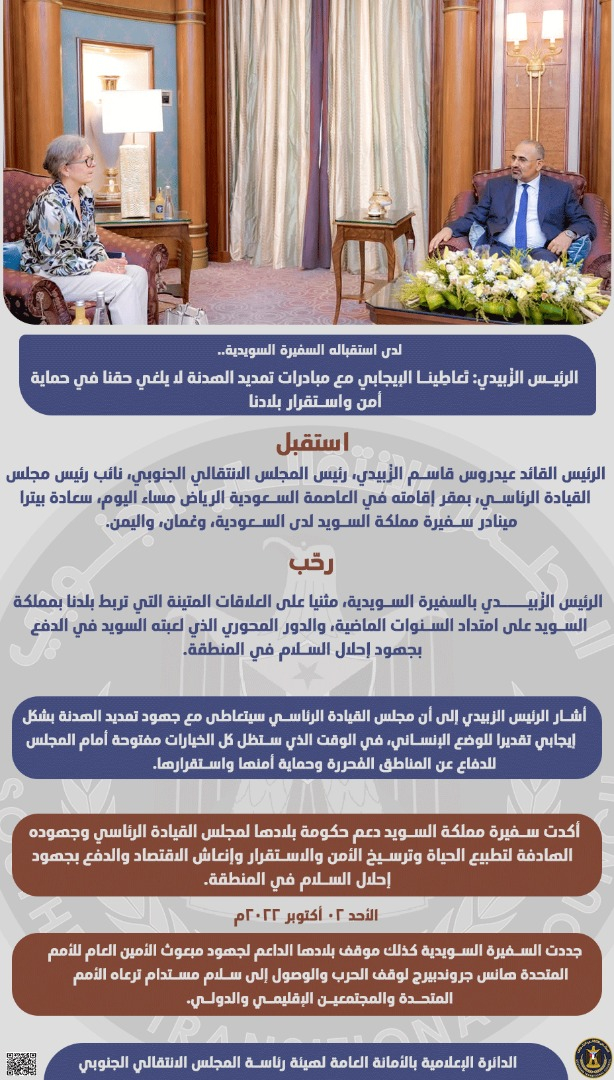 الرئيس الزُبيدي: تَعاطِينا الإيجابي مع مبادرات تمديد الهدنة لا يلغي حقنا في حماية أمن واستقرار بلادنا
