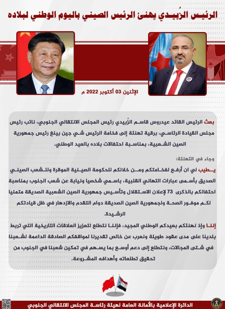 حفظ الصورة الرئيس الزُبيدي يهنئ الرئيس الصيني باليوم الوطني لبلاده الإثنين ٠٣ أكتوبر ٢٠٢٢ الساعة ٠٩:٤٤ مساءً الرئيس الزُبيدي يهنئ الرئيس الصيني باليوم الوطني لبلاده
