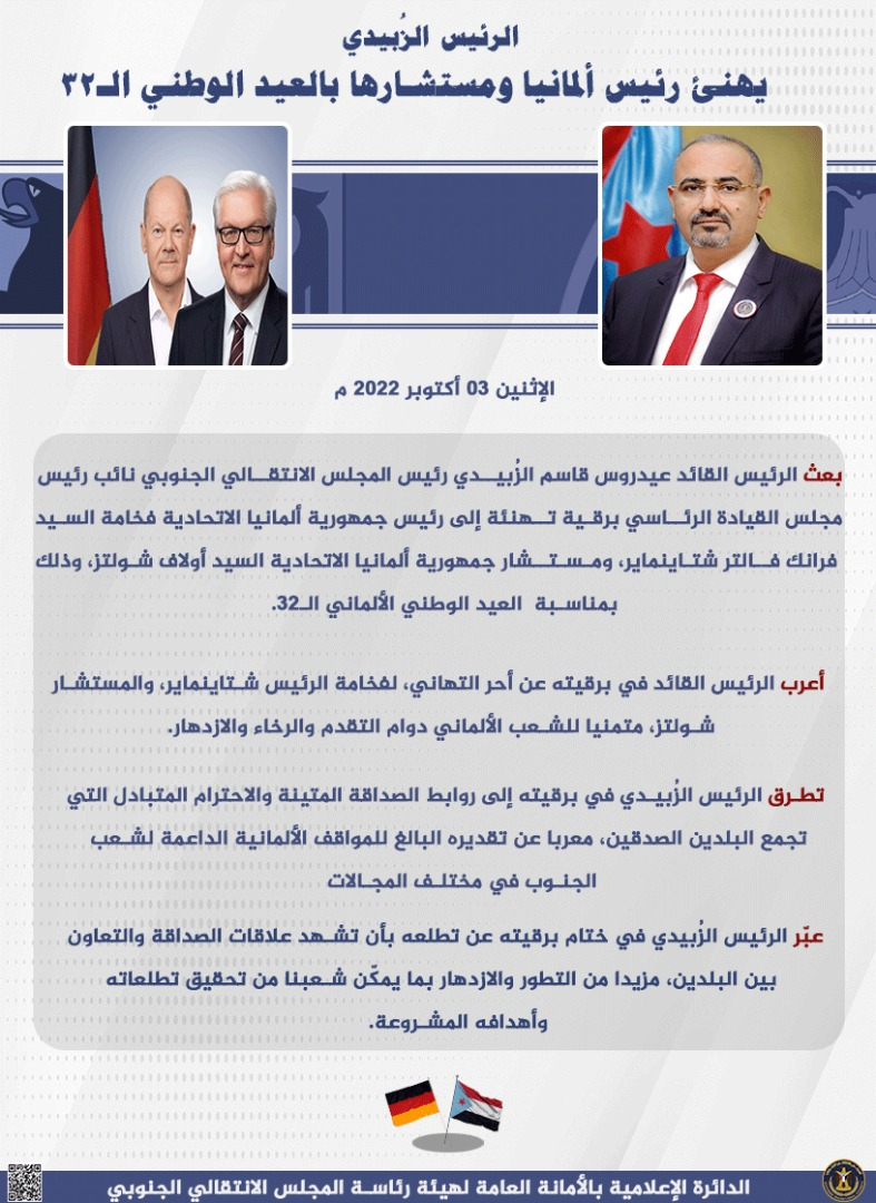 حفظ الصورة الرئيس الزُبيدي يهنئ رئيس ألمانيا ومستشارها بالعيد الوطني الـ32 الإثنين ٠٣ أكتوبر ٢٠٢٢ الساعة ٠٩:٥٣ مساءً الرئيس الزُبيدي يهنئ رئيس ألمانيا ومستشارها بالعيد الوطني الـ32