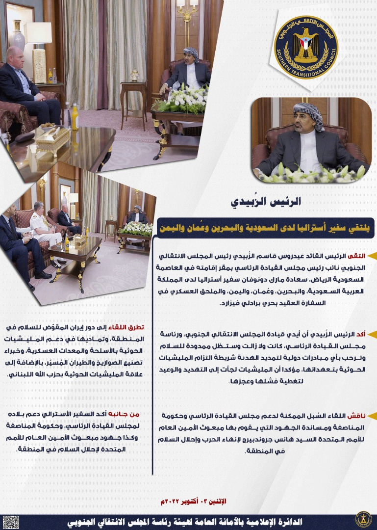 حفظ الصورة الرئيس الزُبيدي يلتقي سفير أستراليا لدى السعودية والبحرين وعُمان واليمن الثلاثاء ٠٤ أكتوبر ٢٠٢٢ الساعة ٠٢:٥٨ صباحاً الرئيس الزُبيدي يلتقي سفير أستراليا لدى السعودية والبحرين وعُمان واليمن
