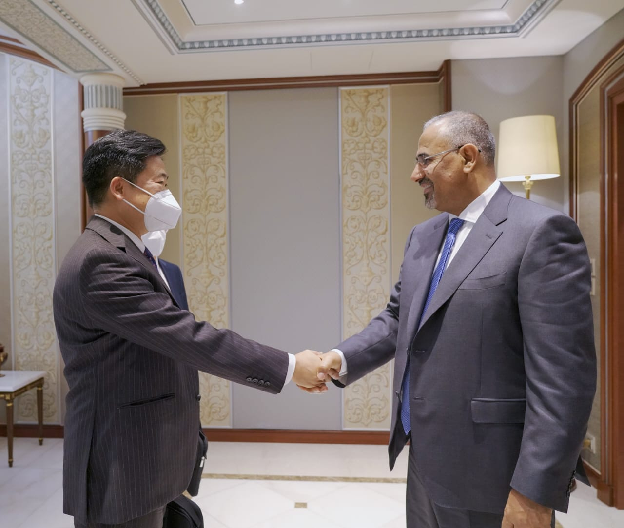 وأثنى الرئيس الزُبيدي في اللقاء، على دور الصين الفاعل في الدفع بجهود إحلال السلام في بلادنا، ودورها الإغاثي لتخفيف المعاناة الإنسانية في المحافظات المُحررة، ودعمها اللامحدود لجهود التنمية في بلادنا عن طريق الاستثمارات في قطاع الصناعات الصغيرة والمتوسطة، وفي مجال التدخلات الطارئة لتأهيل البنية التحتية التي دمرتها الحرب.
