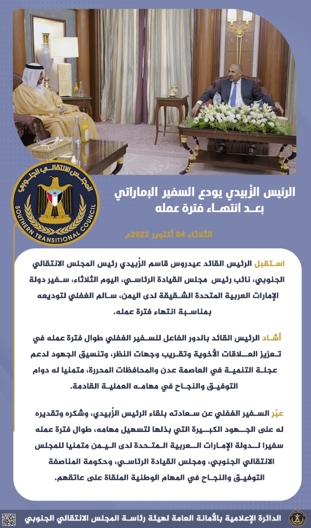 حفظ الصورة الرئيس الزُبيدي يودع السفير الإماراتي بعد انتهاء فترة عمله الثلاثاء ٠٤ أكتوبر ٢٠٢٢ الساعة ٠٩:٤١ مساءً الرئيس الزُبيدي يودع السفير الإماراتي بعد انتهاء فترة عمله
