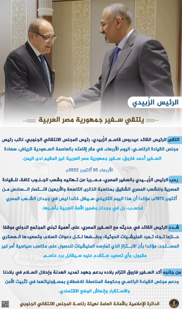 حفظ الصورة الرئيس الزُبيدي يلتقي سفير جمهورية مصر العربية الأربعاء ٠٥ أكتوبر ٢٠٢٢ الساعة ٠٥:١٠ مساءً الرئيس الزُبيدي يلتقي سفير جمهورية مصر العربية