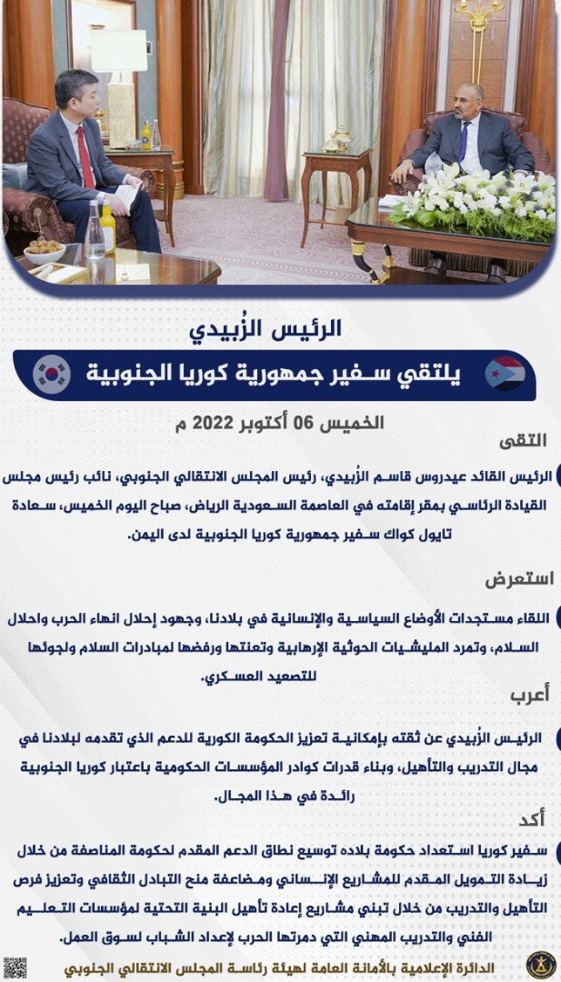 حفظ الصورة الرئيس الزُبيدي يلتقي سفير جمهورية كوريا الجنوبية الخميس ٠٦ أكتوبر ٢٠٢٢ الساعة ٠٩:٣٩ مساءً الرئيس الزُبيدي يلتقي سفير جمهورية كوريا الجنوبية