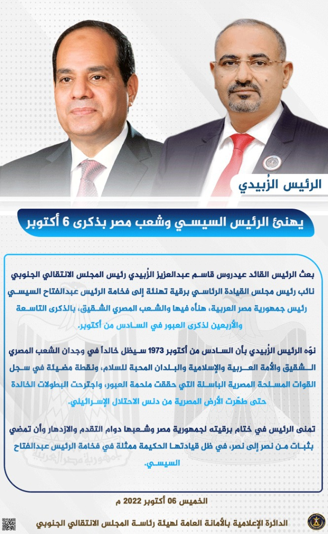 حفظ الصورة الرئيس الزُبيدي يهنئ الرئيس السيسي وشعب مصر بذكرى 6 أكتوبر الخميس ٠٦ أكتوبر ٢٠٢٢ الساعة ٠٩:٤٠ مساءً الرئيس الزُبيدي يهنئ الرئيس السيسي وشعب مصر بذكرى 6 أكتوبر
