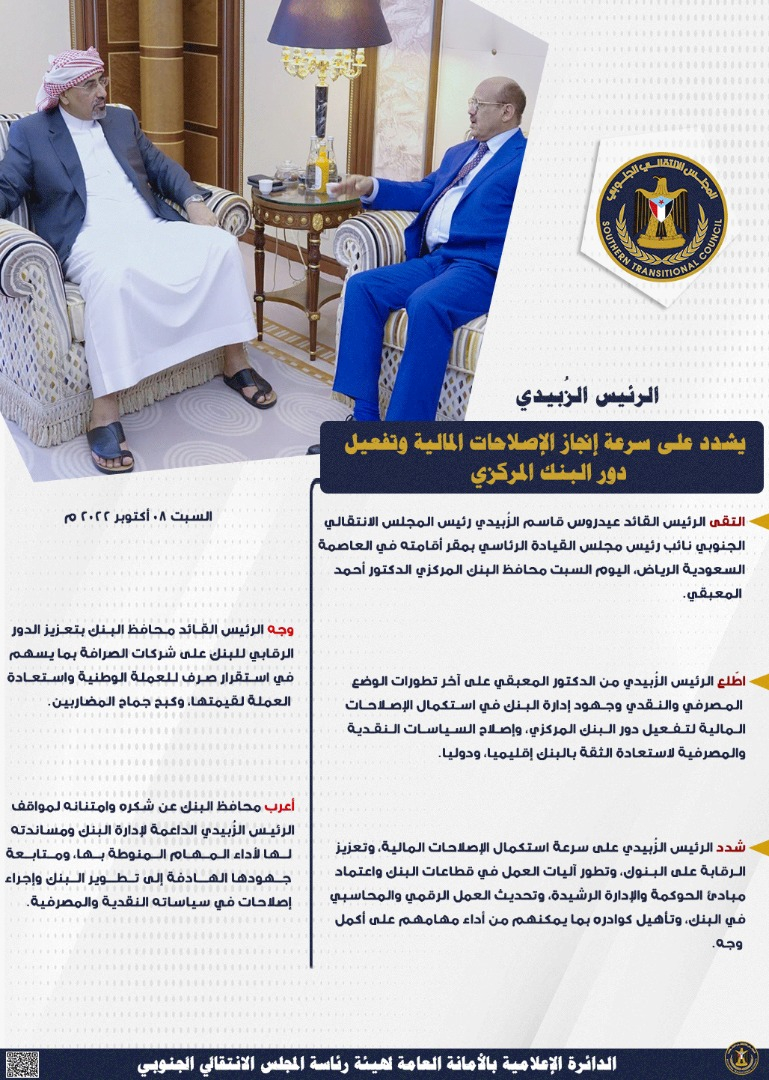 الرئيس الزُبيدي يشدد على أهمية الصيانة الدورية لشبكة الطرق التقى الرئيس القائد عيدروس قاسم الزُبيدي، رئيس المجلس الانتقالي الجنوبي، نائب رئيس مجلس القيادة الرئ...