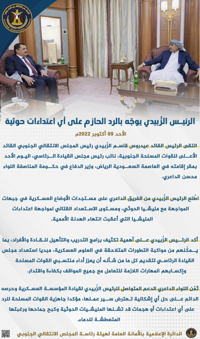 الرئيس الزُبيدي يشدد على أهمية الصيانة الدورية لشبكة الطرق التقى الرئيس القائد عيدروس قاسم الزُبيدي، رئيس المجلس الانتقالي الجنوبي، نائب رئيس مجلس القيادة الرئ...