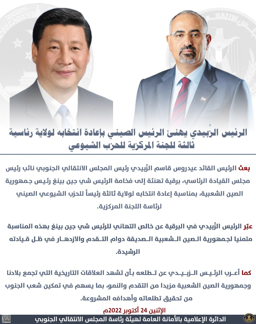 الرئيس الزُبيدي يهنئ الرئيس الصيني بإعادة انتخابه لولاية رئاسية ثالثة للجنة المركزية للحزب الشيوعي