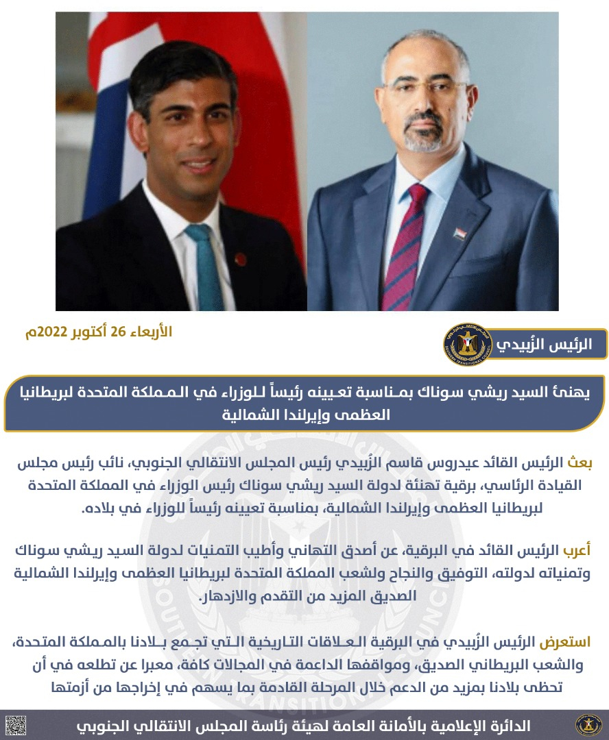الرئيس الزُبيدي يهنئ السيد ريشي سوناك بمناسبة تعيينه رئيساً للوزراء في المملكة المتحدة لبريطانيا العظمى وإيرلندا الشمالية