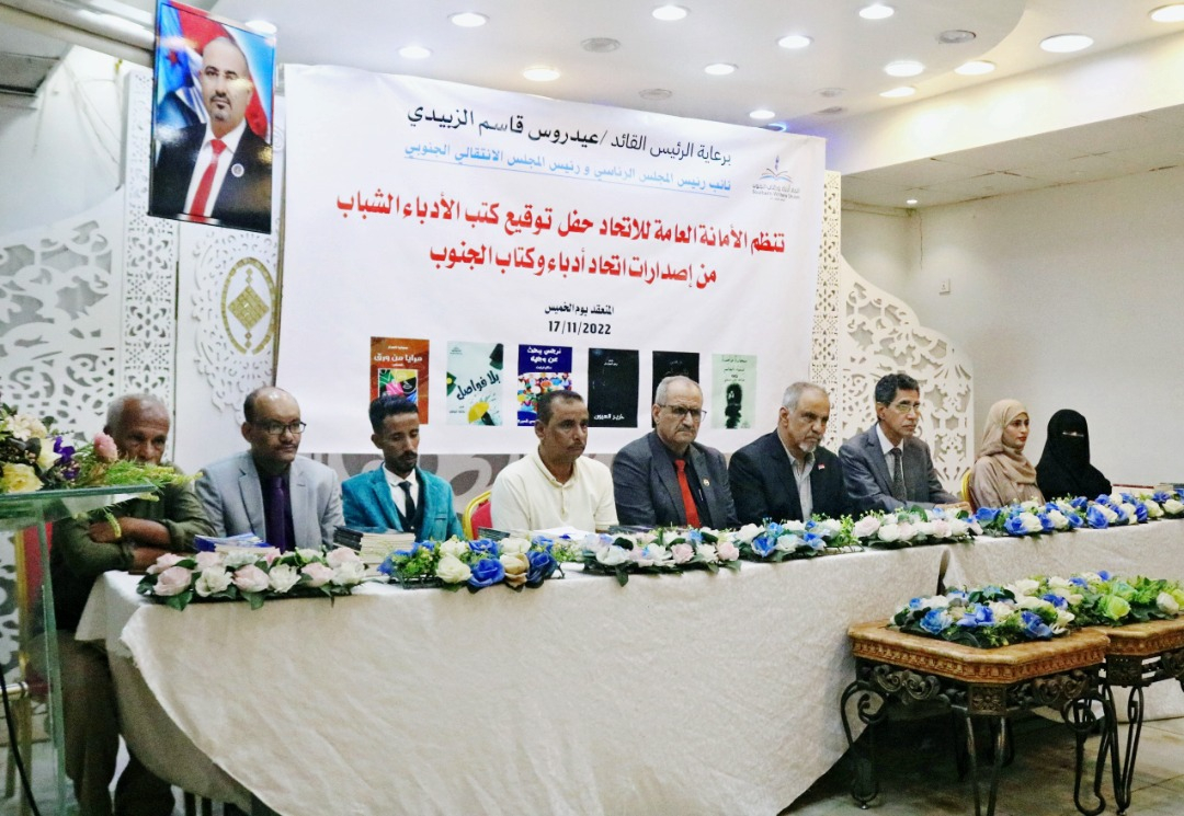 نظمت الأمانة العامة لاتحاد أدباء وكتاب الجنوب، اليوم الخميس، في قاعة قصر العرب، حفل توقيع ست كتب من الإبداعات الأدبية للشباب والشابات من إصدارات اتحاد أدباء وكتاب الجنوب، برعاية الرئيس القائد عيدروس الزبيدي رئيس المجلس الانتقالي الجنوبي، نائب رئيس مجلس القيادة الرئاسي وبحضور الأستاذ فضل محمد الجعدي عضو هيئة الرئاسة نائب الأمين العام للأمانة العامة لهيئة رئاسة المجلس الانتقالي.