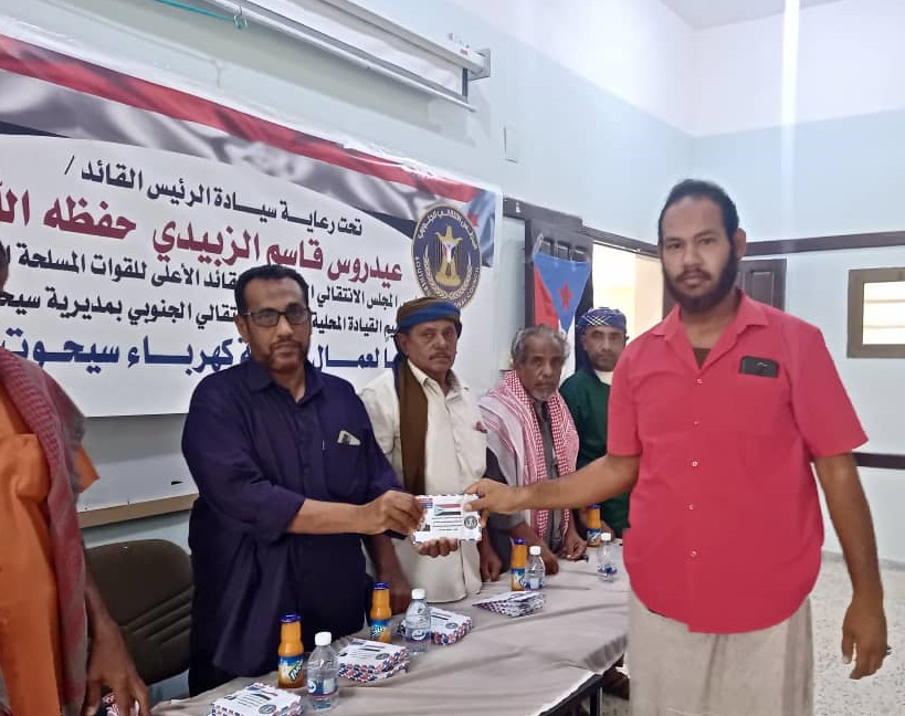 نظمت الإدارة الاجتماعية بالهيئة التنفيذية للمجلس الانتقالي الجنوبي في مديرية سيحوت بمحافظة المهرة، اليوم السبت، حفلا تكريميا لفنيي كهرباء المديرية، ضمن برنامج الأنشطة الاجتماعية للفصل الرابع، برعاية الرئيس القائد عيدروس الزُبيدي رئيس المجلس الانتقالي الجنوبي.