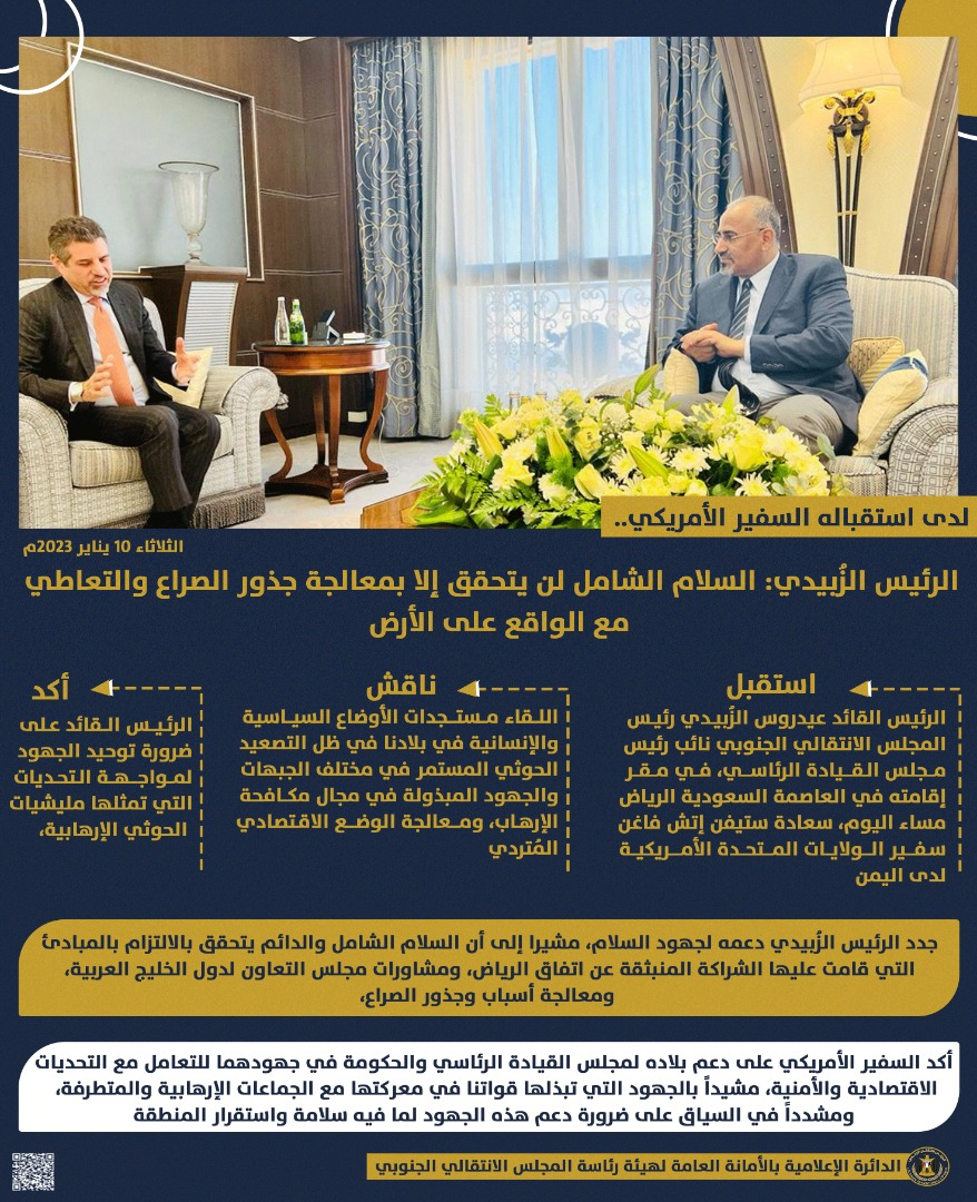 لدى استقباله السفير الأمريكي.. الرئيس الزُبيدي: السلام الشامل لن يتحقق إلا بمعالجة جذور الصراع والتعاطي مع الواقع على الأرض