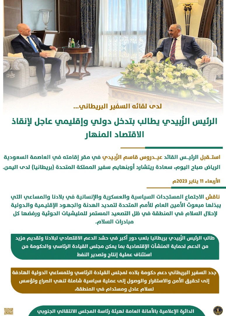 لدى لقائه السفير البريطاني... الرئيس الزُبيدي يطالب بتدخل دولي وإقليمي عاجل لإنقاذ الاقتصاد المنهار