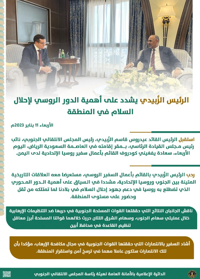 الرئيس الزُبيدي يشدد على أهمية الدور الروسي لإحلال السلام في المنطقة