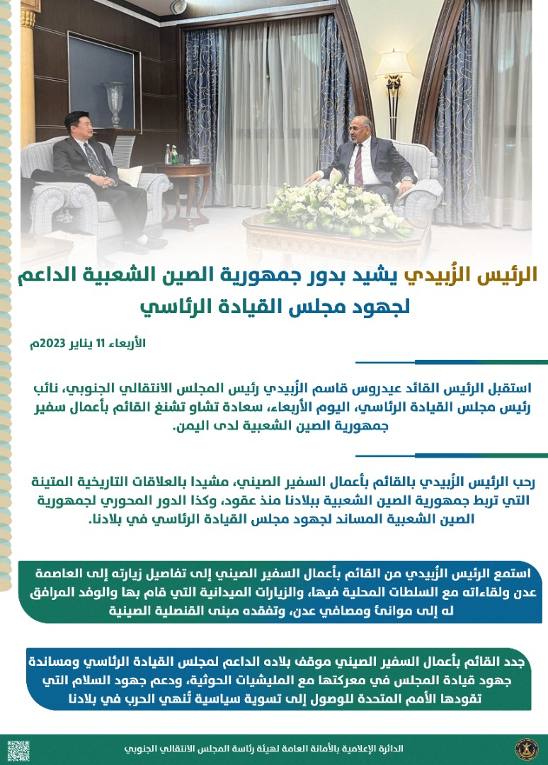 الرئيس الزُبيدي يشيد بدور جمهورية الصين الشعبية الداعم لجهود مجلس القيادة الرئاسي