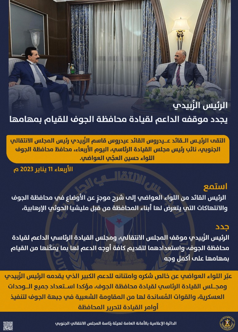 الرئيس الزُبيدي يجدد موقفه الداعم لقيادة محافظة الجوف للقيام بمهامها