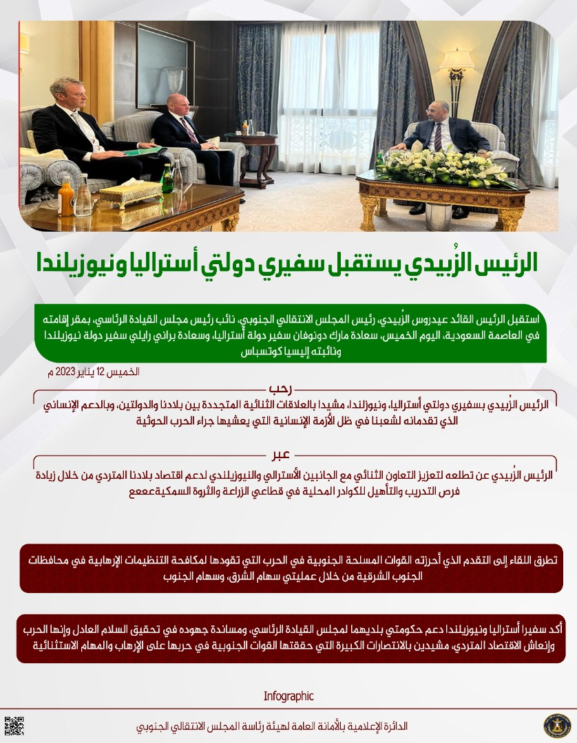 حفظ الصورة الرئيس الزُبيدي يستقبل سفيري دولتي أستراليا ونيوزيلندا الخميس ١٢ يناير ٢٠٢٣ الساعة ٠٥:١٤ مساءً الرئيس الزُبيدي يستقبل سفيري دولتي أستراليا ونيوزيلندا