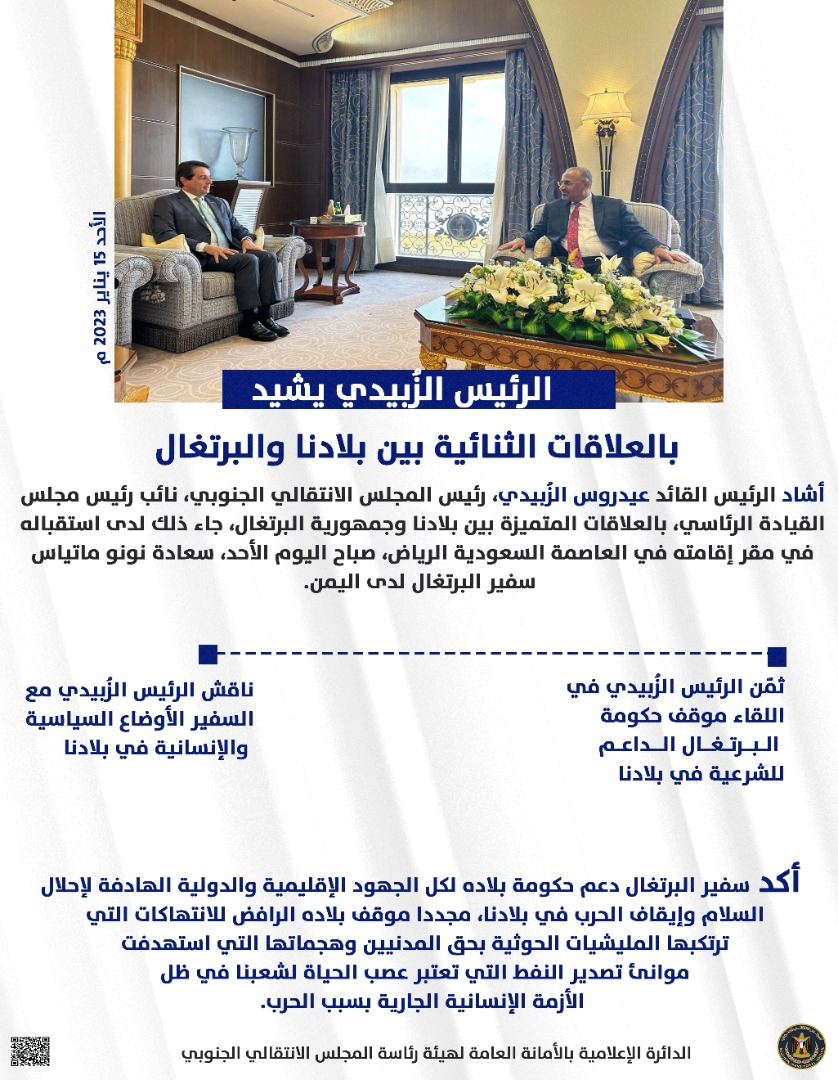 حفظ الصورة الرئيس الزُبيدي يشيد بالعلاقات الثنائية بين بلادنا والبرتغال الإثنين ١٦ يناير ٢٠٢٣ الساعة ٠١:٠٠ صباحاً الرئيس الزُبيدي يشيد بالعلاقات الثنائية بين بلادنا والبرتغال