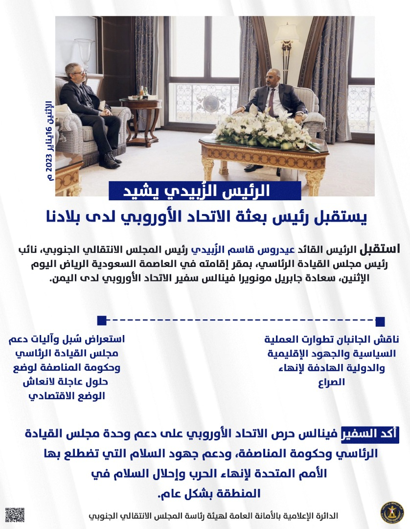 حفظ الصورة الرئيس الزُبيدي يستقبل رئيس بعثة الاتحاد الأوروبي لدى بلادنا الثلاثاء ١٧ يناير ٢٠٢٣ الساعة ٠٥:٠٠ صباحاً الرئيس الزُبيدي يستقبل رئيس بعثة الاتحاد الأوروبي لدى بلادنا
