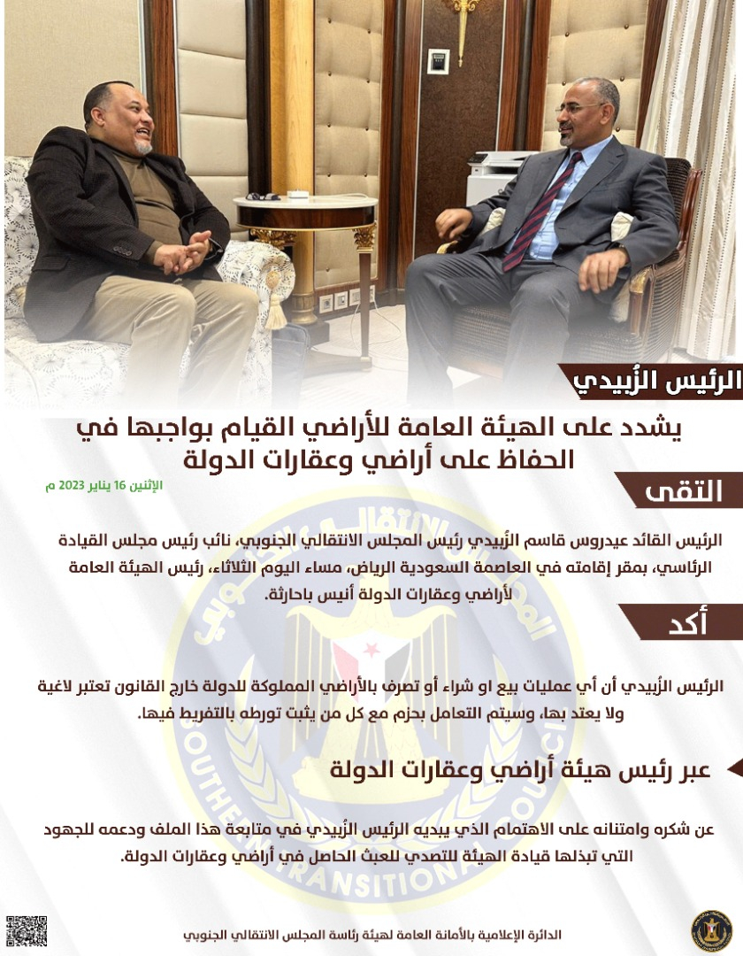 الرئيس الزُبيدي يشدد على الهيئة العامة للأراضي القيام بواجبها في الحفاظ على أراضي وعقارات الدولة