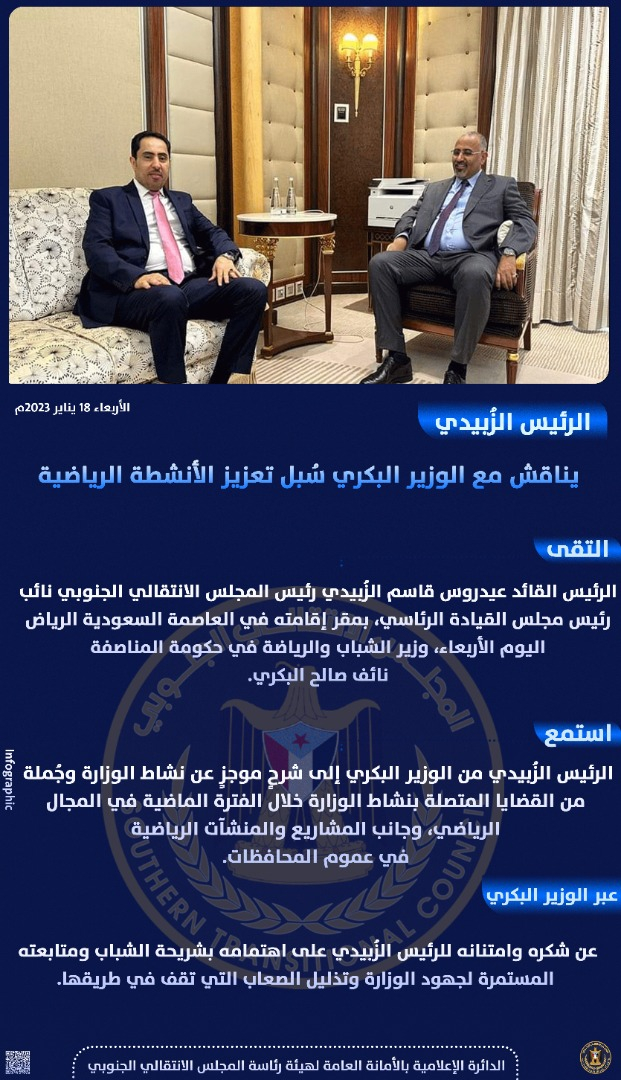 حفظ الصورة الرئيس الزُبيدي يناقش مع الوزير البكري سُبل تعزيز الأنشطة الرياضية الخميس ١٩ يناير ٢٠٢٣ الساعة ٠٢:٠١ مساءً الرئيس الزُبيدي يناقش مع الوزير البكري سُبل تعزيز الأنشطة الرياضية
