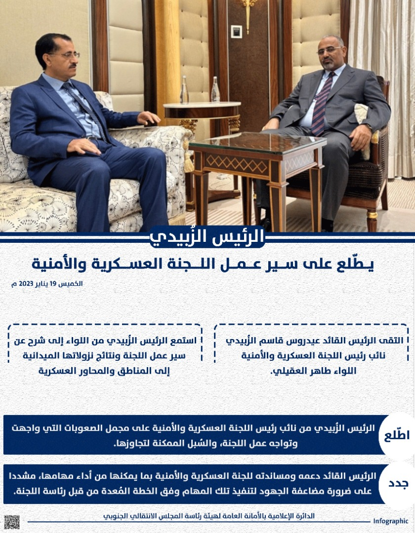 حفظ الصورة الرئيس الزُبيدي يطّلع على سير عمل اللجنة العسكرية والأمنية الخميس ١٩ يناير ٢٠٢٣ الساعة ٠٨:٠١ مساءً الرئيس الزُبيدي يطّلع على سير عمل اللجنة العسكرية والأمنية
