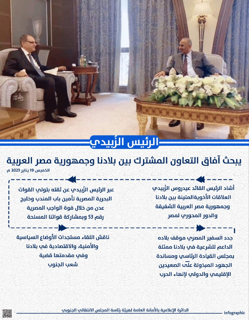 الرئيس الزُبيدي يبحث آفاق التعاون المشترك بين بلادنا وجمهورية مصر العربية